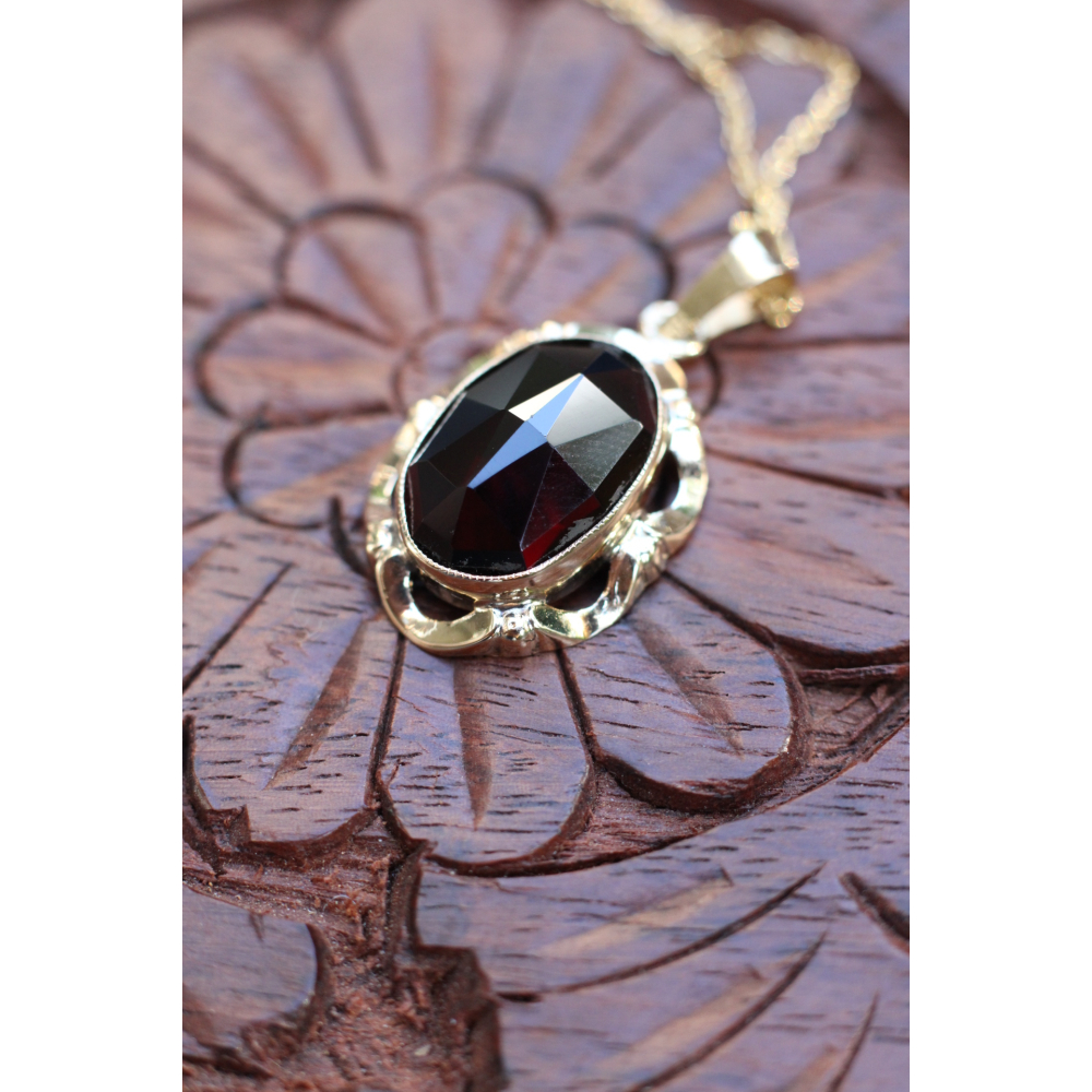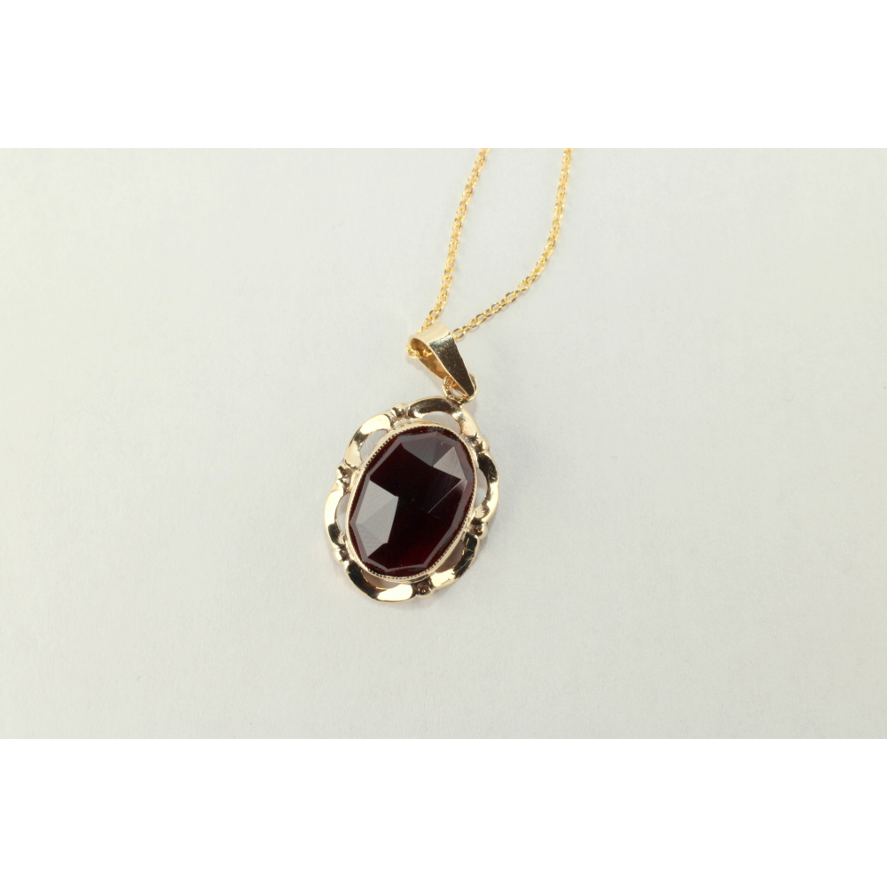 Een 14 kt geelgouden hanger met roos geslepen granaat, waarbij het warme goud de diepe roodtinten van de granaat prachtig accentueert. Elegant en tijdloos, perfect voor elke gelegenheid.