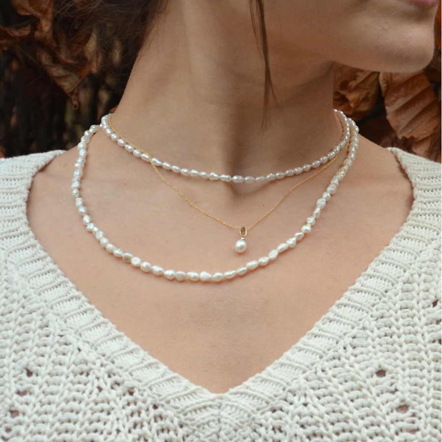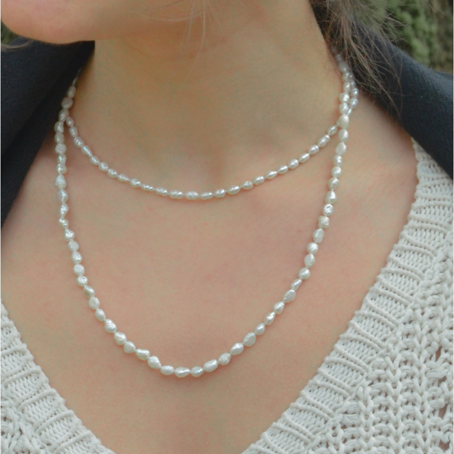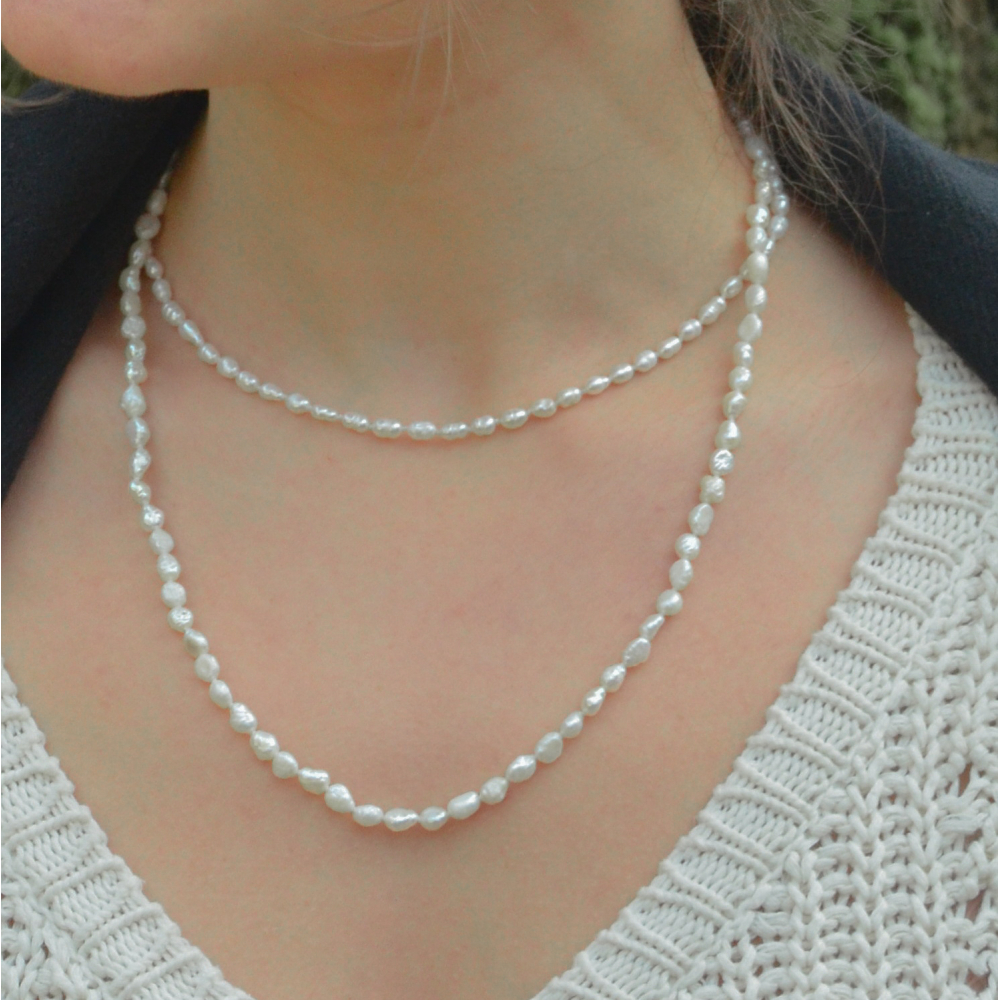 Een klassiek en elegant sieraad, dit parelcollier is verkrijgbaar op 40 cm of op 55 cm en is met zorg geknoopt en afgewerkt met een verfijnd geelgouden slot. De zachte glans van de parels en de warme gloed van het goud creëren samen een tijdloze uitstraling, perfect voor elke gelegenheid.