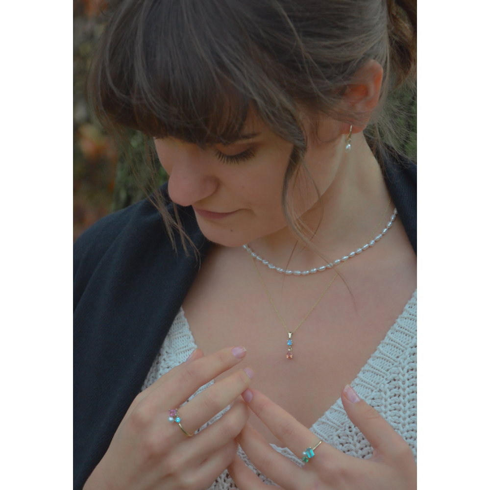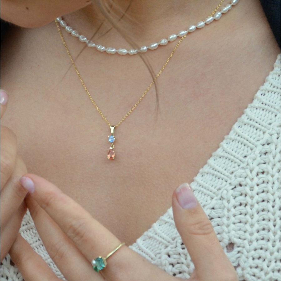 De Charlotte hanger is vervaardigd uit 14 kt geelgoud en combineert een helder blauwe saffier met een druppelvormige oranje saffier. Samen zorgen ze voor een verfijnd kleurenspel dat warmte en elegantie uitstraalt, perfect voor een tijdloze en bijzondere uitstraling.