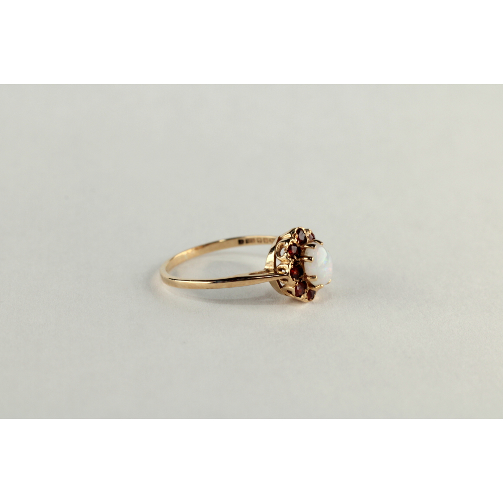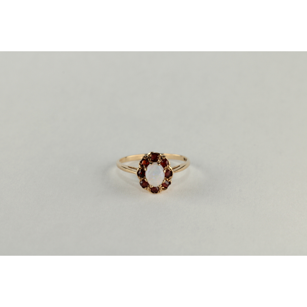 Deze charmante 9 karaat vintage ring is subtiel gezet met een glanzende opaal en een rode granaat edelstenen. Het verfijnde ontwerp en de kleine, elegante vorm maken dit sieraad perfect voor dagelijks dragen of als stijlvol accent bij andere sieraden.