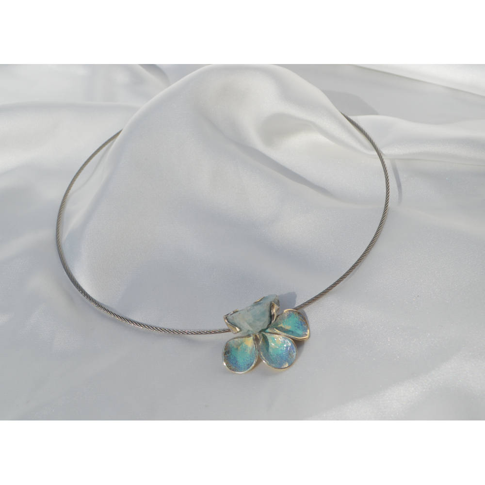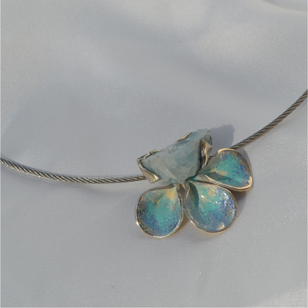 Laat je meenemen naar de weelderige pracht van het Russische hof met dit bijzondere collier uit de Yuveliniya collectie. Geïnspireerd door de overdadige en kleurrijke sieraden van de tsarentijd. Het ontwerp is geïnspireerd op een bloem en versierd met een ruwe aquamarijn. De halve bloem is 3,5 cm en maakt van dit collier een statement piece dat je met trots draagt en je look een koninklijk en sprookjesachtig karakter verleent.