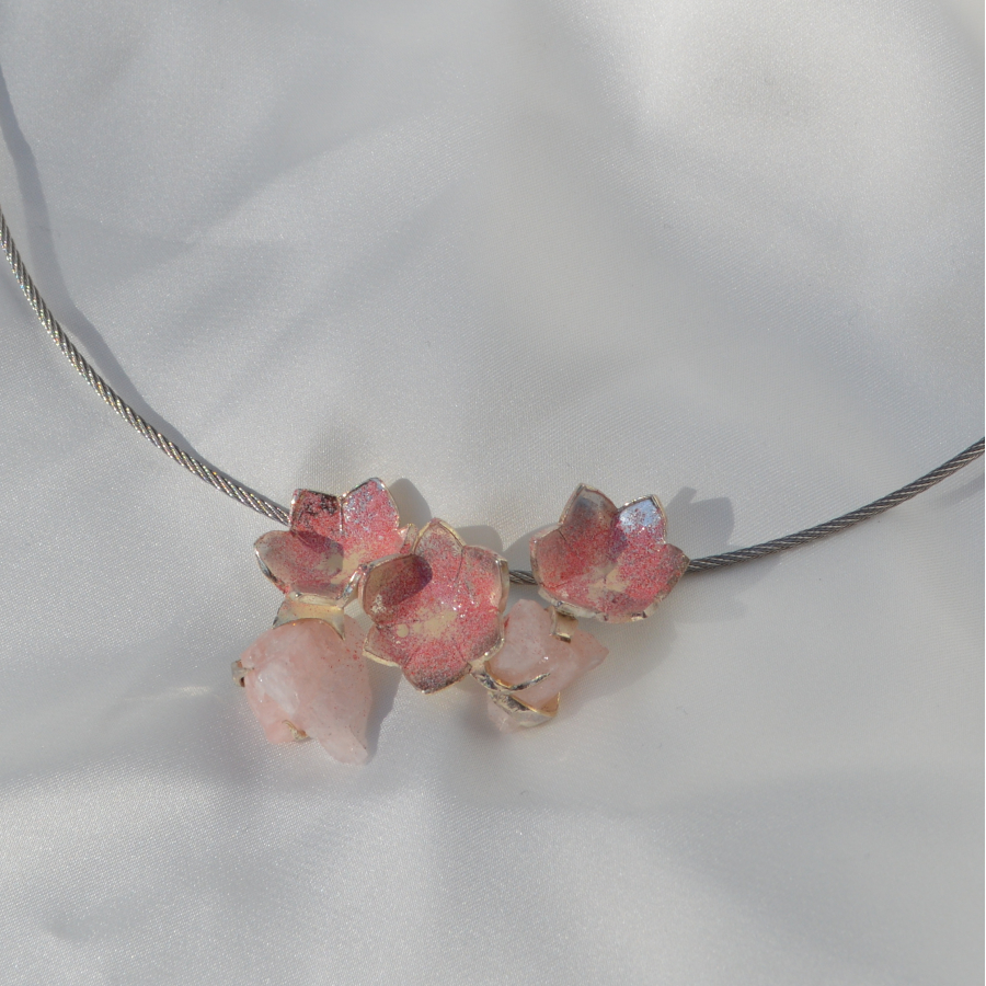 Laat je meenemen naar de weelderige pracht van het Russische hof met dit bijzondere collier uit de Yuveliniya collectie. Geïnspireerd door de overdadige en kleurrijke sieraden van de tsarentijd. Het ontwerp is geïnspireerd op een bloemenveld en versierd met 2 ruwe rozenkwarts. De bloemen hanger is 5 cm en maakt van dit collier een statement piece dat je met trots draagt en je look een koninklijk en sprookjesachtig karakter verleent.