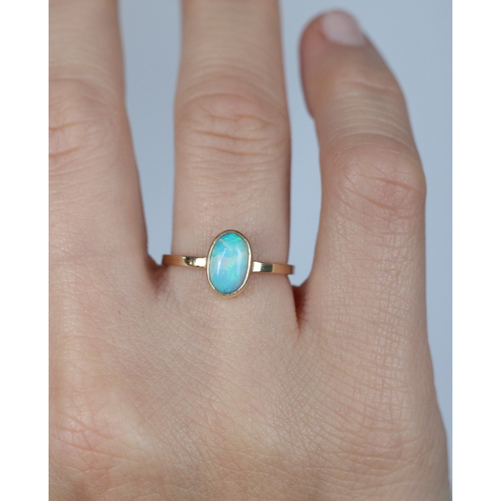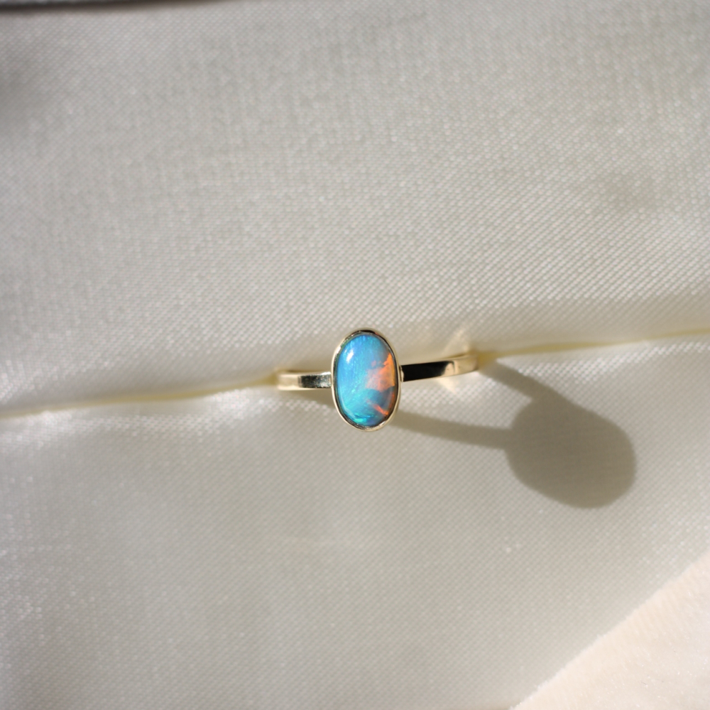 Deze schitterende ring is vervaardigd uit 14 karaat geelgoud en gezet met een betoverende opaal in blauwtinten en groene schakeringen. De warme glans van het goud accentueert de levendige kleuren van de edelsteen, waardoor een tijdloos en elegant sieraad ontstaat dat zowel verfijning als speelsheid uitstraalt.