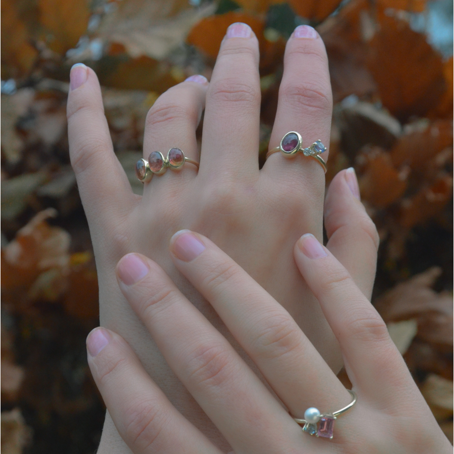 De Emma ring, vervaardigd uit 14 kt geelgoud, is verfraaid met drie ovale cabochon geslepen roze toermalijnen. De subtiele glans en warme roze tinten geven de ring een luxe en elegante uitstraling, terwijl het ontwerp tijdloos en verfijnd blijft. Een sieraad dat je look op een elegante manier accentueert.