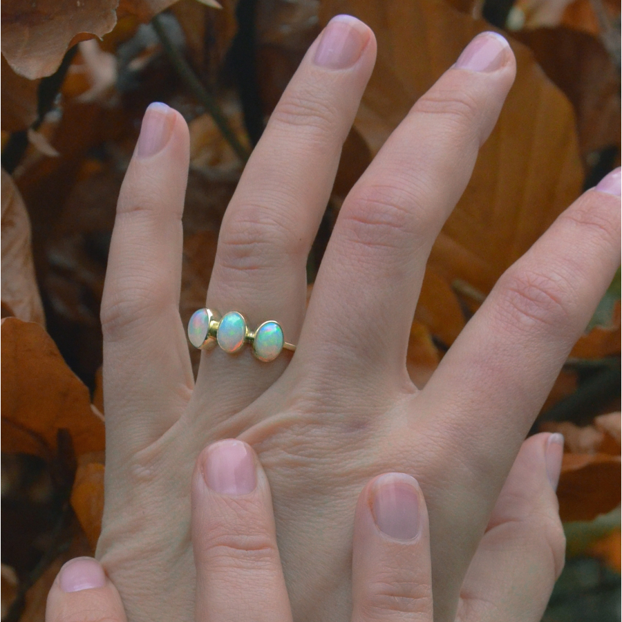 De 14 kt geelgouden ring schittert met drie cabochon geslepen opalen. Het betoverende kleurenspel en de subtiele glans van de stenen vormen een prachtig geheel met het warme goud, waardoor de ring een verfijnde en unieke uitstraling krijgt.
