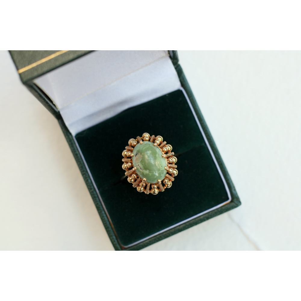Deze 18 karaat geelgouden ring is een uniek sieraad met een prachtige zetting waarin een ovale groene turquoise schittert. De levendige kleur van de steen combineert harmonieus met de warme gloed van het goud, waardoor de ring een bijzonder en elegant sieraad is.