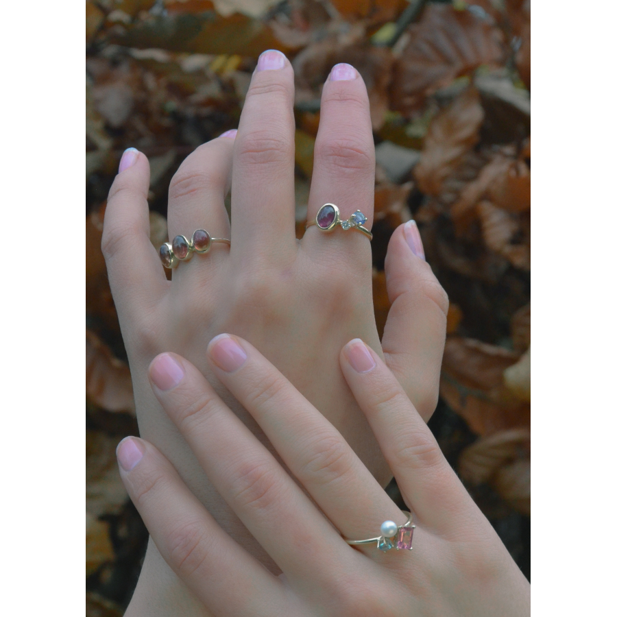 Voeg een vleugje kleur en elegantie toe met deze 14 kt geelgouden ring, versierd met een cabochon geslepen roze toermalijn, een paarse ioliet en een sprankelende diamant. Een tijdloos sieraad dat zowel opvallend als verfijnd is.